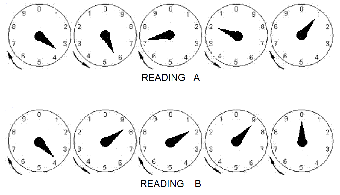 Some homes have meters with a series of dials that are most easily read from right to left. When the pointer is between numbers, read the lower number.