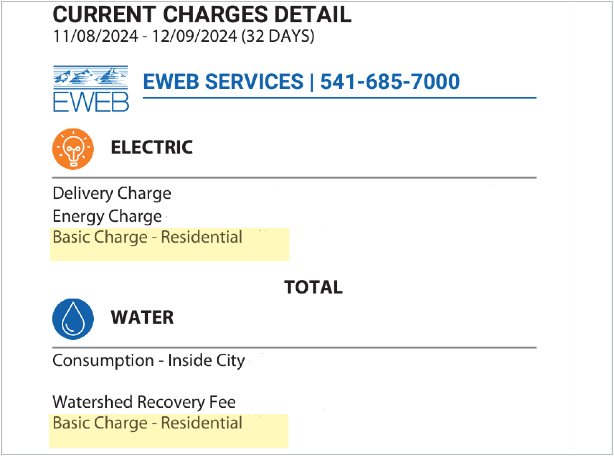 If you look at your EWEB bill, you will notice different types of charges that make up the total amount owed. These types of charges vary by customer class (residential, commercial, and industrial), but fixed charges (cost of basic service) and volumetric charges (kWh and KGAL) are always present.