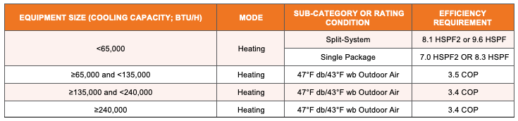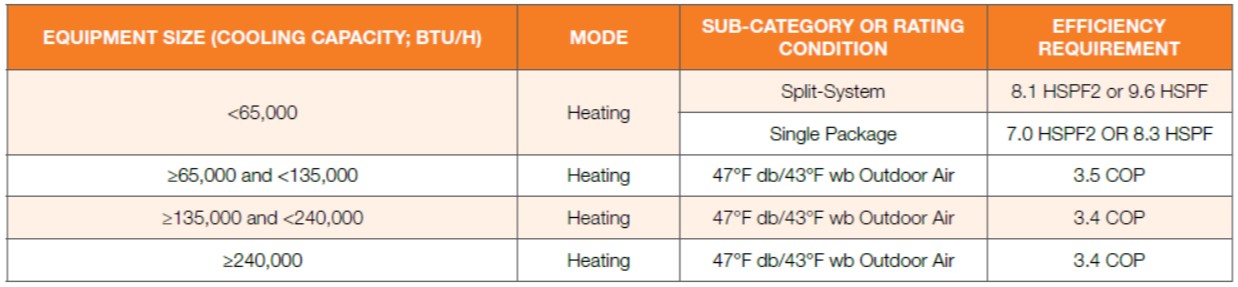 Upgrade/new construction: Must meet efficiencies by capacity in the table below. The ASHP Upgrade measure may be used for any project where the post-condition requirements are met including new construction/major renovation projects, retrofits replacing existing heat pumps, retrofits replacing equipment using a fuel source other than electric, and retrofits that qualify for the ASHP Retrofit measure.